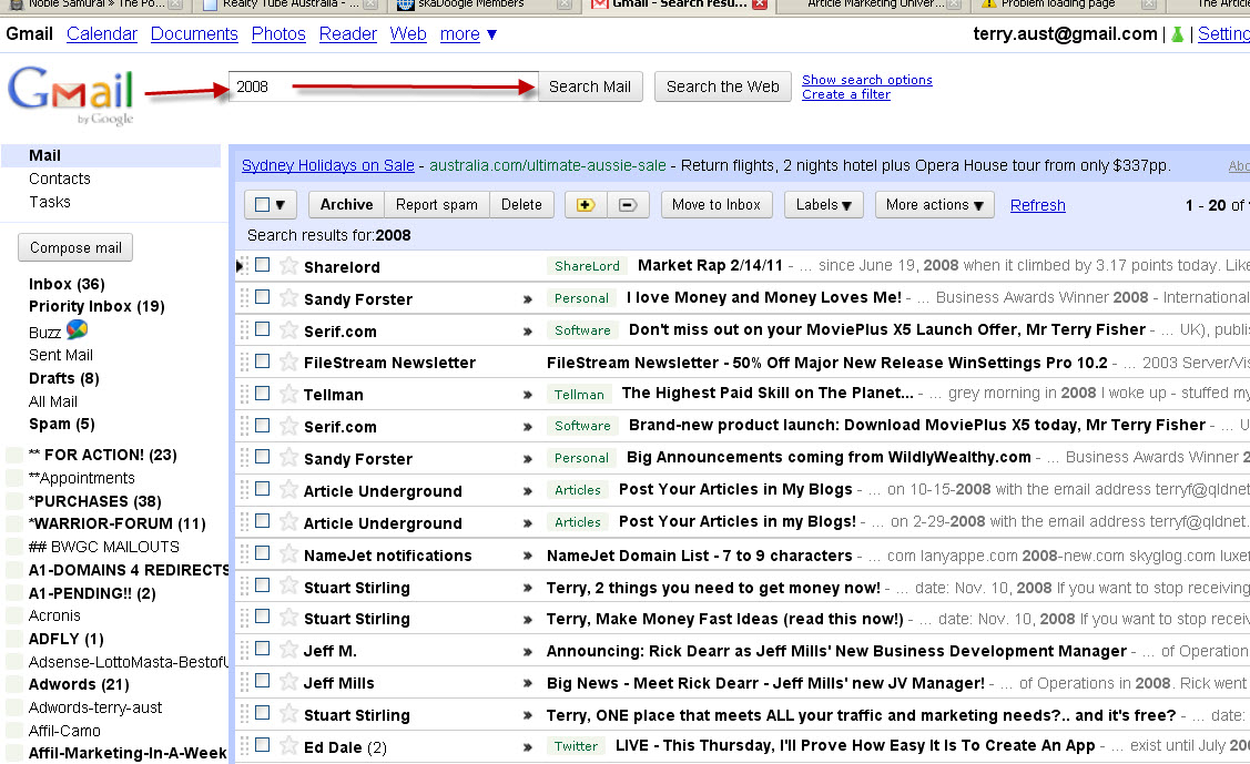 Gmail is also brilliant when you want to declutter your email. You can search for “2008” and locate all emails with the date 2008. The brave can select “delete all” but I recommend selecting all and then just running your eye down the list for things you should keep, like software licence details. Set display options to “50” and you can declutter your email real quick.